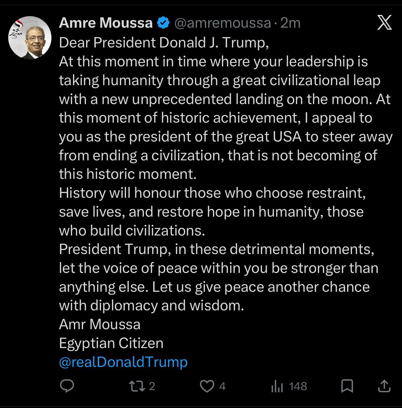 At this moment in time where your leadership is taking humanity through a great civilizational leap with a new unprecedented landing on the moon. At this moment of historic achievement, I appeal to you as the president of the great USA to steer away from ending a civilization, that is not becoming of this historic moment.