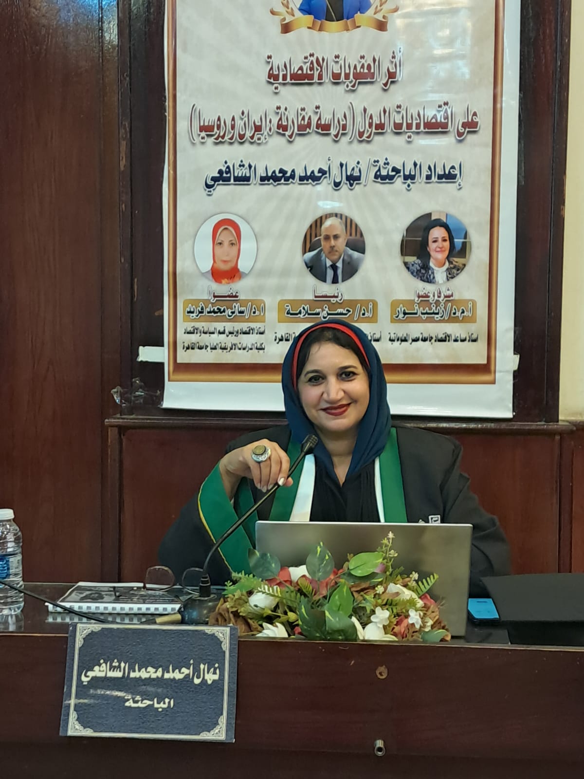 وضمت لجنة المناقشة والحكم: والدكتور حسن سلامة أستاذ الاقتصاد والعلوم السياسية جامعة القاهرة (رئيسا)، والدكتورة زينب نوار استاذ مساعد الاقتصاد جامعة مصر المعلوماتية (مشرفا وعضوا) ،