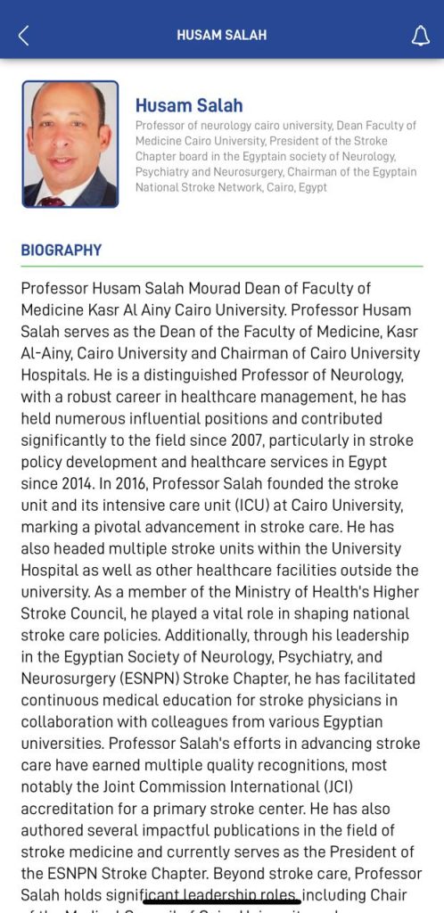 ويُعد الأستاذ الدكتور حسام صلاح مراد أحد أبرز الشخصيات العلمية في مجال السكتة الدماغية، وهو أستاذ طب الأعصاب بجامعة القاهرة، وعميد كلية الطب – قصر العيني، ورئيس مجلس إدارة مستشفيات جامعة القاهرة. يتمتع بخبرة مهنية واسعة في إدارة الرعاية الصحية وتطوير خدمات الأعصاب، وقد شغل العديد من المناصب المؤثرة منذ عام 2007، لا سيما في المشاركه مع اعضاء الشعبه في تطوير سياسات السكتة الدماغية وخدمات الرعاية العصبية في مصر منذ عام 2014.