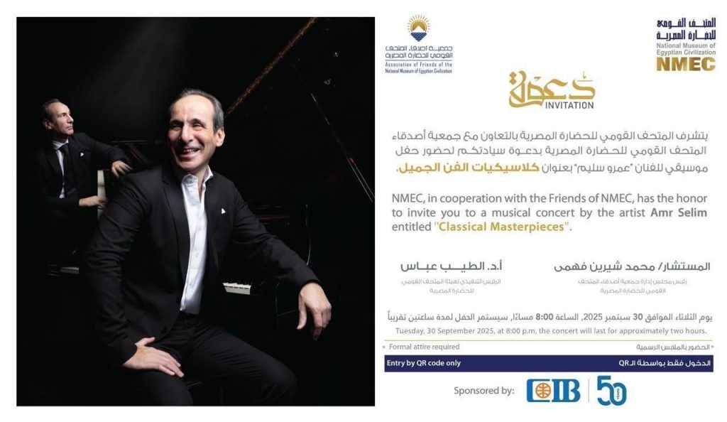 في خطوة تؤكد على دوره الحيوي كمنصة للإشعاع الثقافي والفني، استضاف المتحف القومي للحضارة المصرية (NMEC) حفل موسيقي استثنائي بعنوان “كلاسيكيات الفن الجميل” للفنان والموسيقار الكبير عمرو سليم. ويأتي هذا الحفل بالتعاون مع جمعية أصدقاء المتحف القومي للحضارة المصرية.